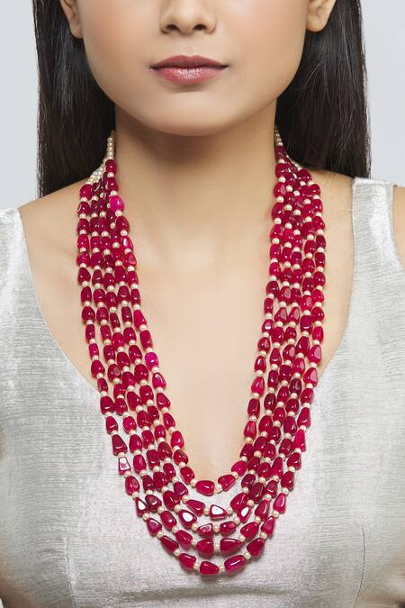 Gold plated layered necklace embellished with ruby stones & pearls.