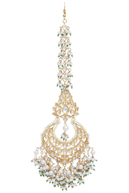 Gold hued maangtikka featuring intricate polki stones and cascading pearl drops