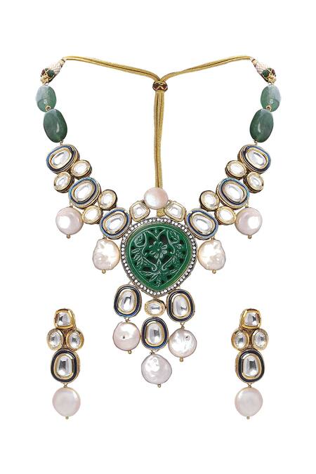Gold toned necklace with embellished stones & green carved centre piece. Comes with drop earrings.