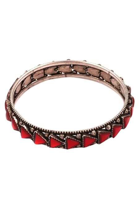 Handcrafted silver-hued oxidized bangle with red stones in geometric pattern.