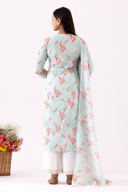 Blue straight fit kurta featuring a round neckline, three quarter sleeves, and an asymmetric hem. Paired with a matching pant and dupatta, all adorned with a flower bloom print.