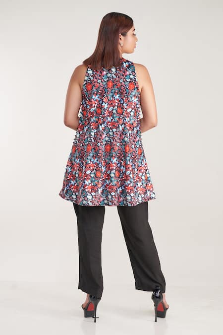 Black floral printed long top featuring round neckline and sleeveless design. Paired with relaxed fit pants in pure natural crepe fabric.