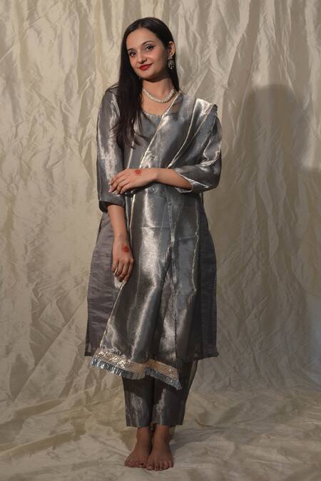 Grey straight kurta in a tissue fabric featuring a round neckline and three-fourth sleeves. Paired with a straight pant and a dupatta adorned with a gota border and fringe.