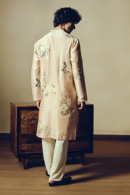 100% pure silk chanderi kurta in blossom pink with a bold abstract floral design. The interplay of colors against the soft background creates a stunning visual impact.