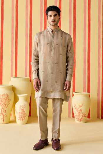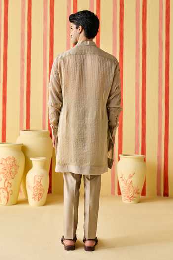 Beige kurta pant set in organza, organza tissue stripe and chanderi fabric that offers a light, airy feel with subtle richness.