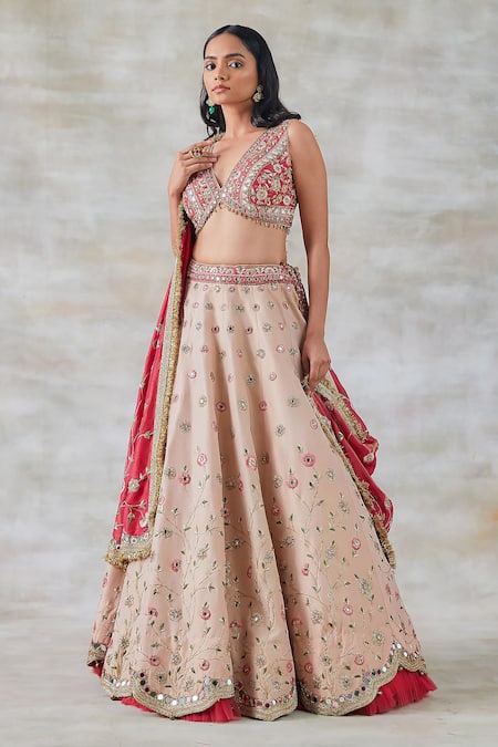 Blush pink lehenga featuring intricate gota, sequin, and mirror embellishments. Paired with a sleeveless padded blouse and a fringe-bordered dupatta.