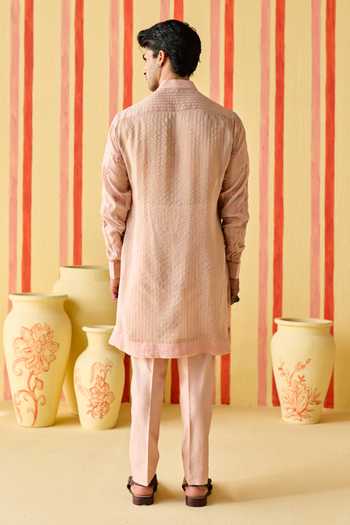Kurta pant set made using a mix of organza, organza tissue stripe and chanderi. The combination gives a light, airy feel with subtle richness.