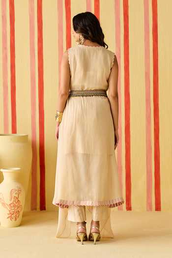 Beige kurta set features a flowing Organza Modal Chanderi kurta with layered asymmetric hem and intricate Resham, Dori and Zardozi embroidery. Paired with a matching pant, it has an attached lining and hook-eye closure.