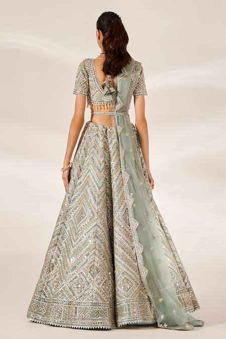 Grey and green lehenga featuring all over mirror and thread embroidery. Paired with a padded blouse and a dupatta adorned with geometric mirror embroidered buttis.