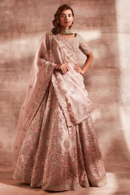 Pink Organza Leaf Neck Embroidered Bridal Lehenga Set