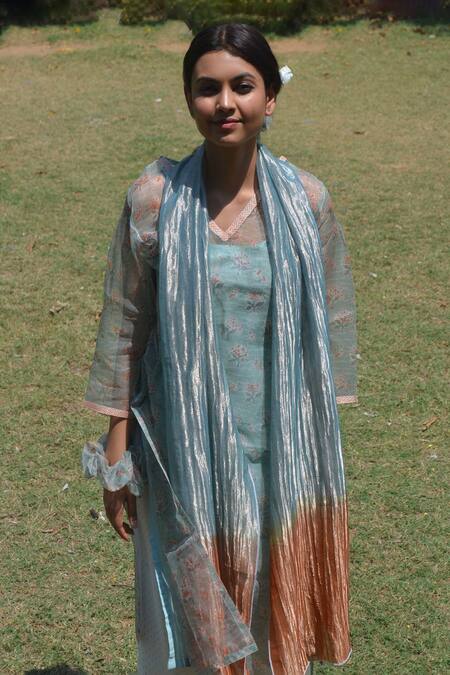 Blue Organza, Tissue, Cotton Embroidery V-neck Asmaan Bouquet Print Kurta Set