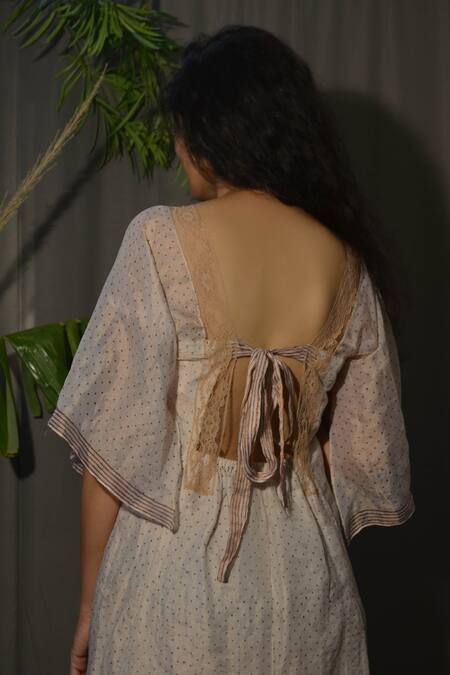 Back tie-up knot detail, Flared sleeves design, Floral lace embellished neckline