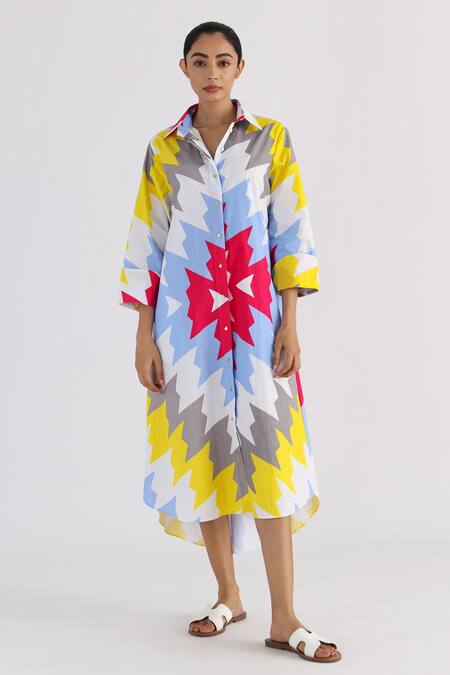 Vibrant aztec print design, Front button closure, Shirt collar detail