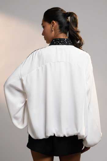 White Georgette Blend shacket with two-way zipper and mirror embellishment on collar and sleeves.