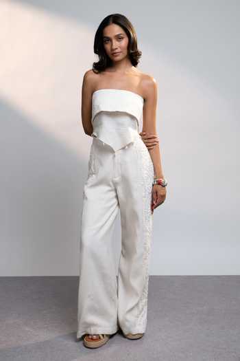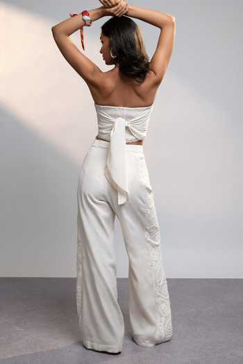 White linen pant with a paisley side panel and textured embroidery.
