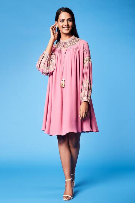 Pink georgette dress with embroidered Parsi floral motifs & tassel tie-up.