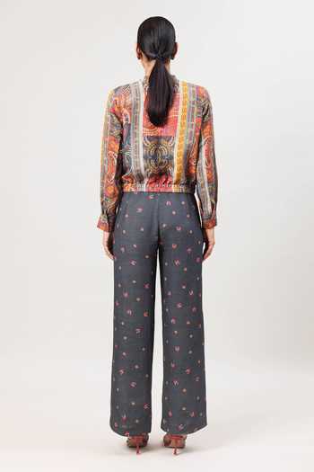 Paisley and ditsy floral print, Straight-fit pants with side pockets, Mandarin collar jacket with front zip
