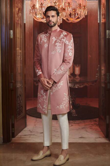 Dusky rose pink sherwani with white floral applique work. Comes with raw silk straight pants.