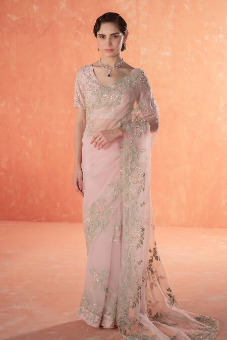 Pink organza saree featuring an all-over wild rose pattern with contrast dori, pearl, beads, cut dana, and sequin embroidery. Paired with an embroidered padded blouse with a scalloped cut work hem and a cut work back detail.