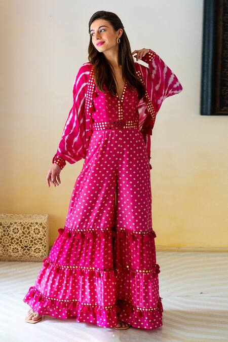 Buy_Surily G_Pink Chanderi Leheriya, Mirror Open Pattern Cape_at_Aza_Fashions