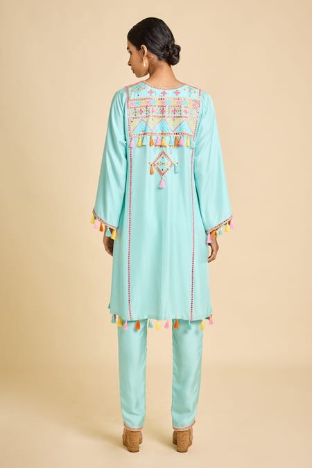 Blue short kurta with multicolor embroidered yoke paired with straight pants.