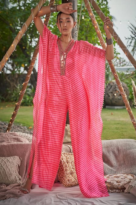 Neon pink silk jumpsuit featuring a leheriya print with a hand embroidered V-neckline adorned with shells, sequins, and beads