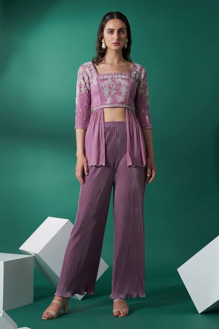 Buy_Suruchi Parakh_Purple Satin, Georgette Crepe Floral Motifs Asymmetric Crop Top And Pant Set_Online_at_Aza_Fashions