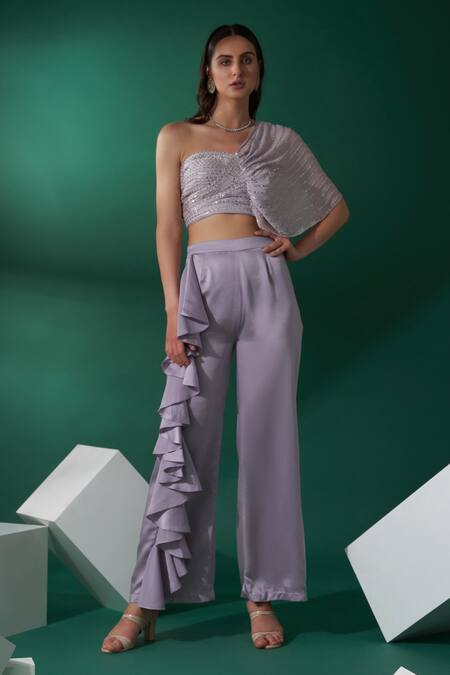 Buy_Suruchi Parakh_Purple Satin, Georgette Crepe One Shoulder Draped Crop Top And Ruffle Pant Set_Online_at_Aza_Fashions