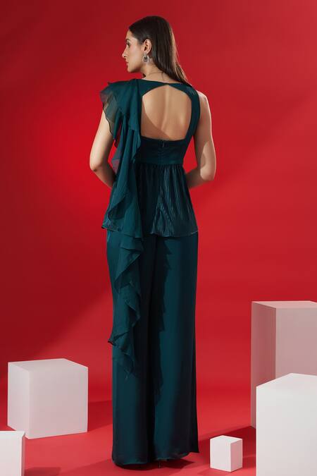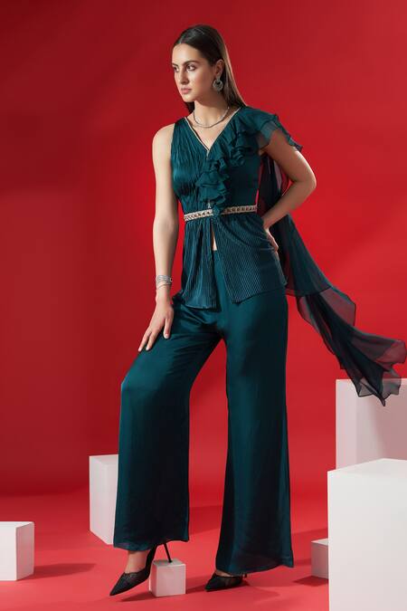 Green peplum top with hand pleats, draped ruffle dupatta & hand embroidered neckline & belt. Paired with straight fit pant.