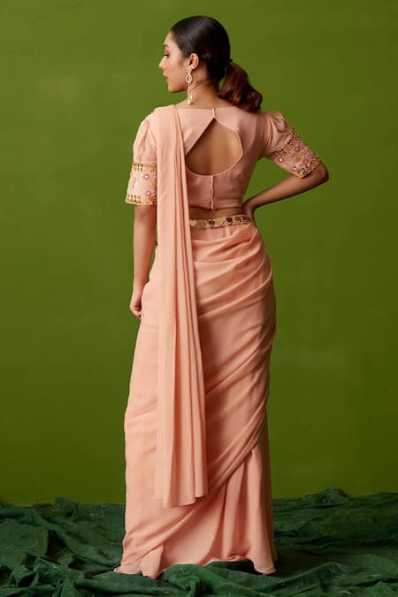 Peach pre-draped saree in georgette crepe featuring floral, thread & mirror embroidery. Paired with a padded blouse with a square neckline and puffed sleeves.