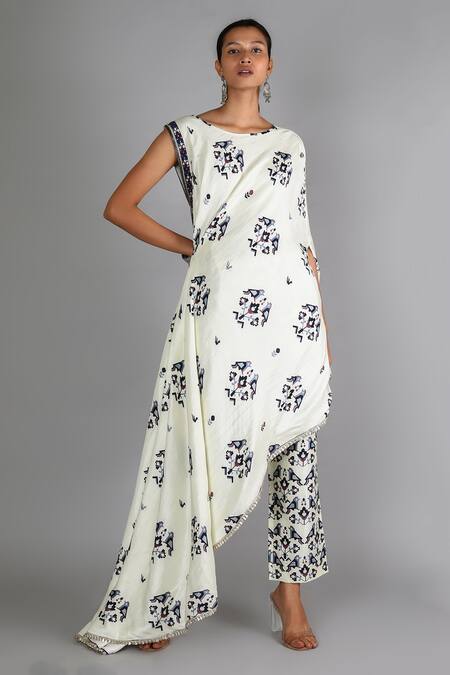 Off white draped kurta with geometric bird print, draped sleeve & lace border. Paired with damask printed straight pant.