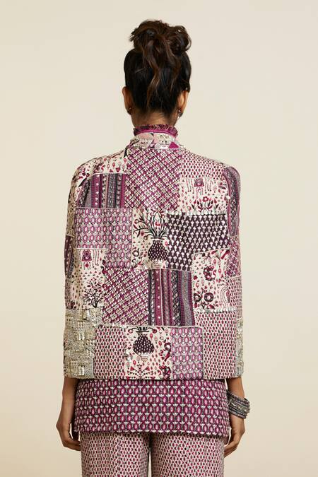 Pink jacket featuring floral, thread, beads, and sequins embroidered patchwork