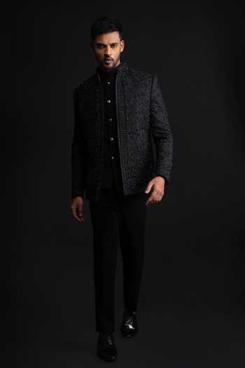 Black silk bandhgala jacket with embroidered embellishments and stonework. Paired with a kurta and pant.