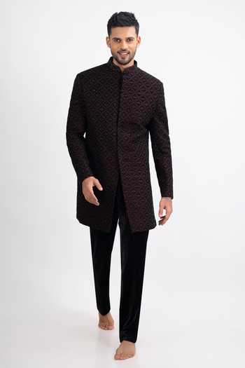 Maroon velvet Bandhgala with embroidered texture and thread embroidery. Paired with Pant.