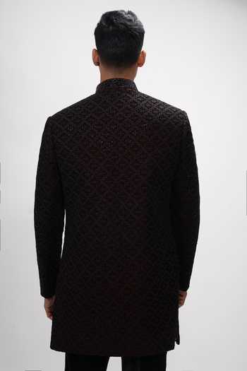 Maroon Velvet Beads, Stones, Cut Work Embroidered Bandhgala And Kurta Set