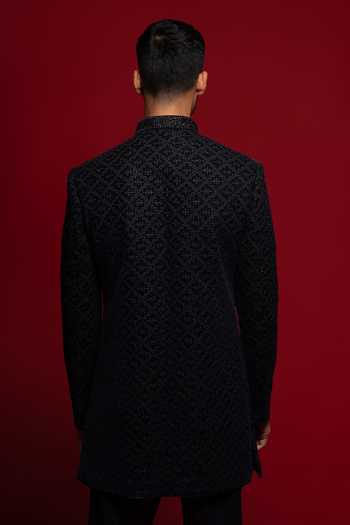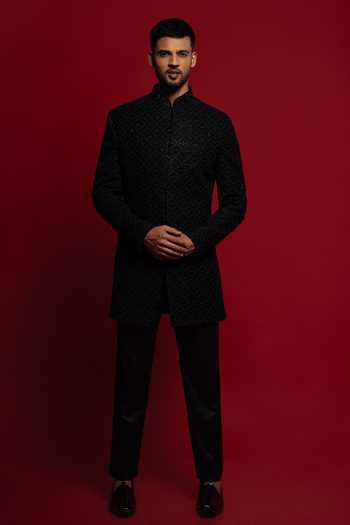 Black velvet sherwani with subtle embroidered pattern and thread embroidery with cutdana and stone detailing. Paired with a kurta and pant.
