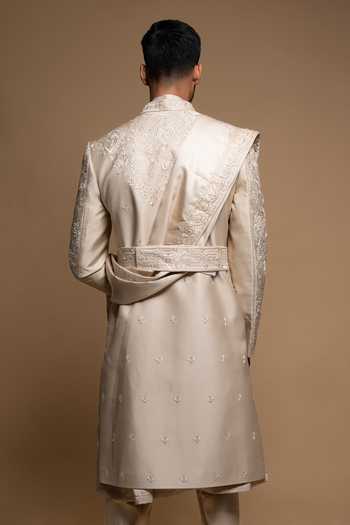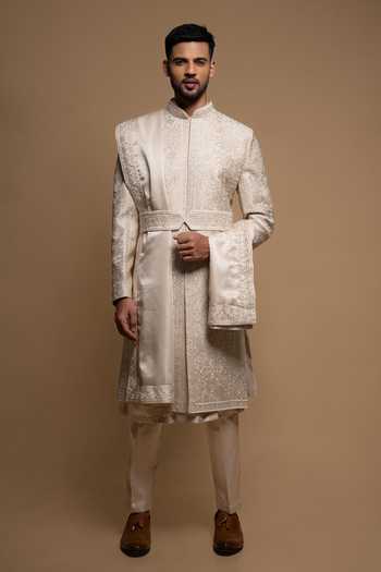 Intricate thread and cutdana embroidery,Structured sherwani silhouette,Includes coordinating dupatta