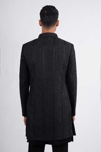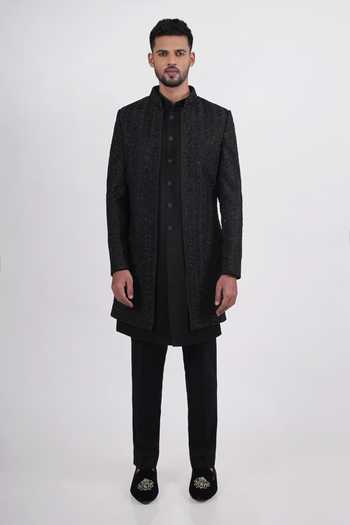 Sherwani set designed with clean lines and balanced proportions. Features fine detailing that enhances its refined and modern character.