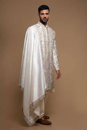 Off White silk sherwani with intricate zardosi embroidery and gold detailing. Paired with matching pant.