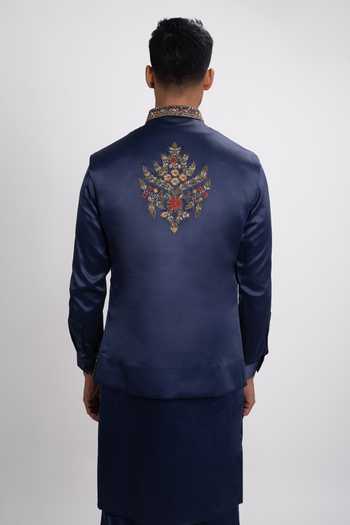 Blue satin Bundi with intricate multicolour floral embroidery and sequin work. Paired with a blue kurta and pant.