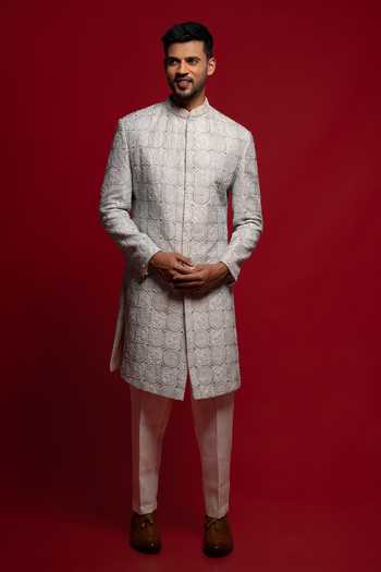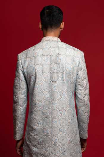 Blue silk sherwani with embroidered circular motifs and neat detailing, paired with a kurta and off-white trousers.