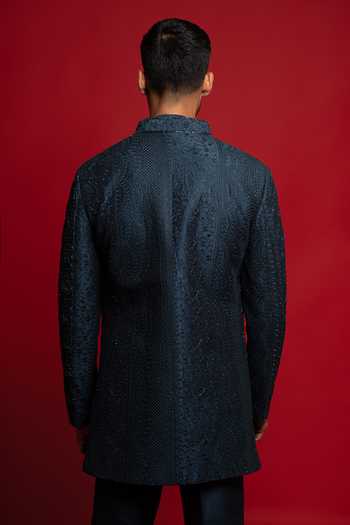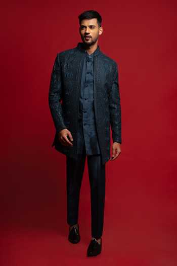 Green silk sherwani with intricate thread embroidery and stone embellishments. Paired with kurta and pant.