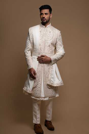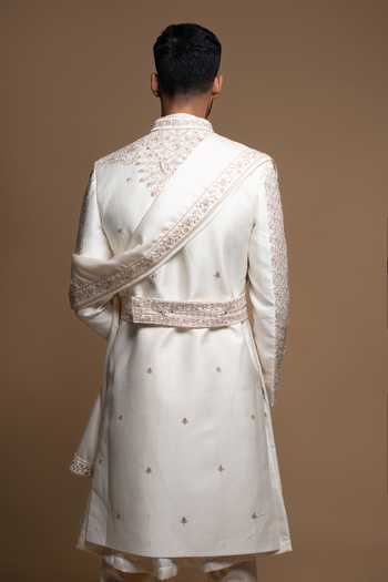 Off White silk sherwani with layered embroidered motifs and thread embroidery. Paired with kurta, belt, dupatta and matching pant.