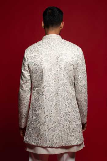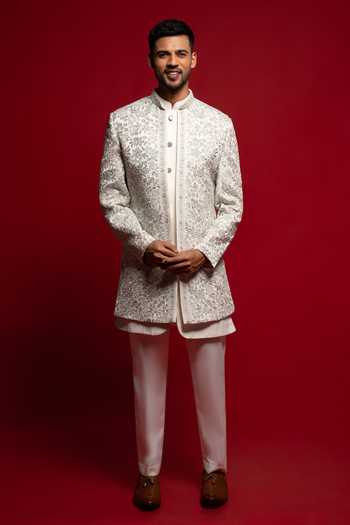 White silk sherwani ensemble combines a sleek silhouette with soft, intricate detailing. Designed for versatile occasions.