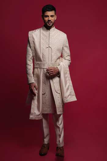 Beige silk sherwani with intricate embroidery & cutdana and stone embellishment. Paired with coordinating pant, kurta, belt and dupatta.