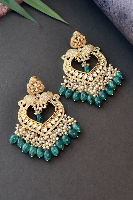 Green bead drops, Kundan and zircon embellishments, Gold toned finish