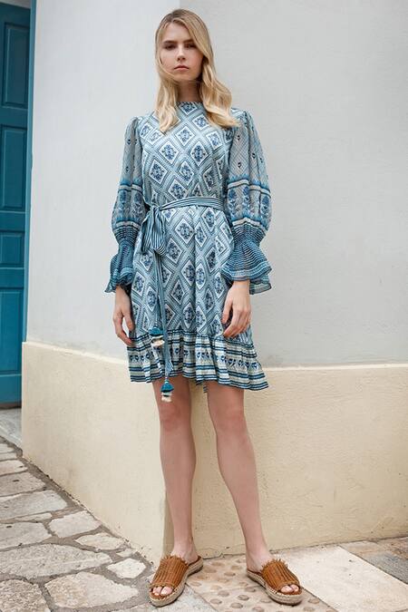 The bluish-grey printed Swara Dress is a youthful addition to any wardrobe, with its lightweight silhouette. It s cinched at the waist with a striped fabric belt with tasselled edges.