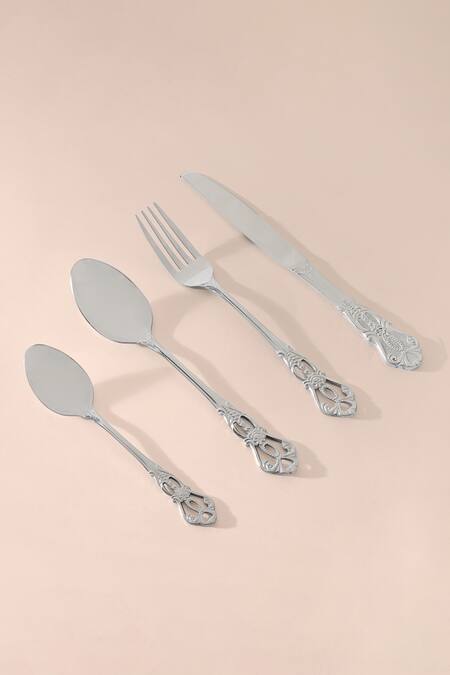 Silver set of 4 engraved cutlery with 304 stainless steel finish, includes 1 dinner fork, 1 dinner spoon, 1 dinner knife, 1 dessert spoon.