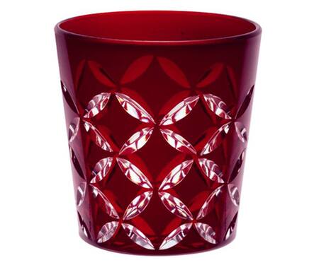 Red round glass water tumbler with contrast tone leaf motifs jaal work & cutwork detail.
