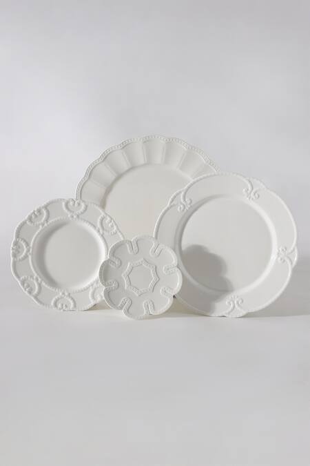 White embossed and scallop trimmed dinner set, includes 1 charger plate, 1 dinner plate, 1 quarter plate and 1 dessert plate.
